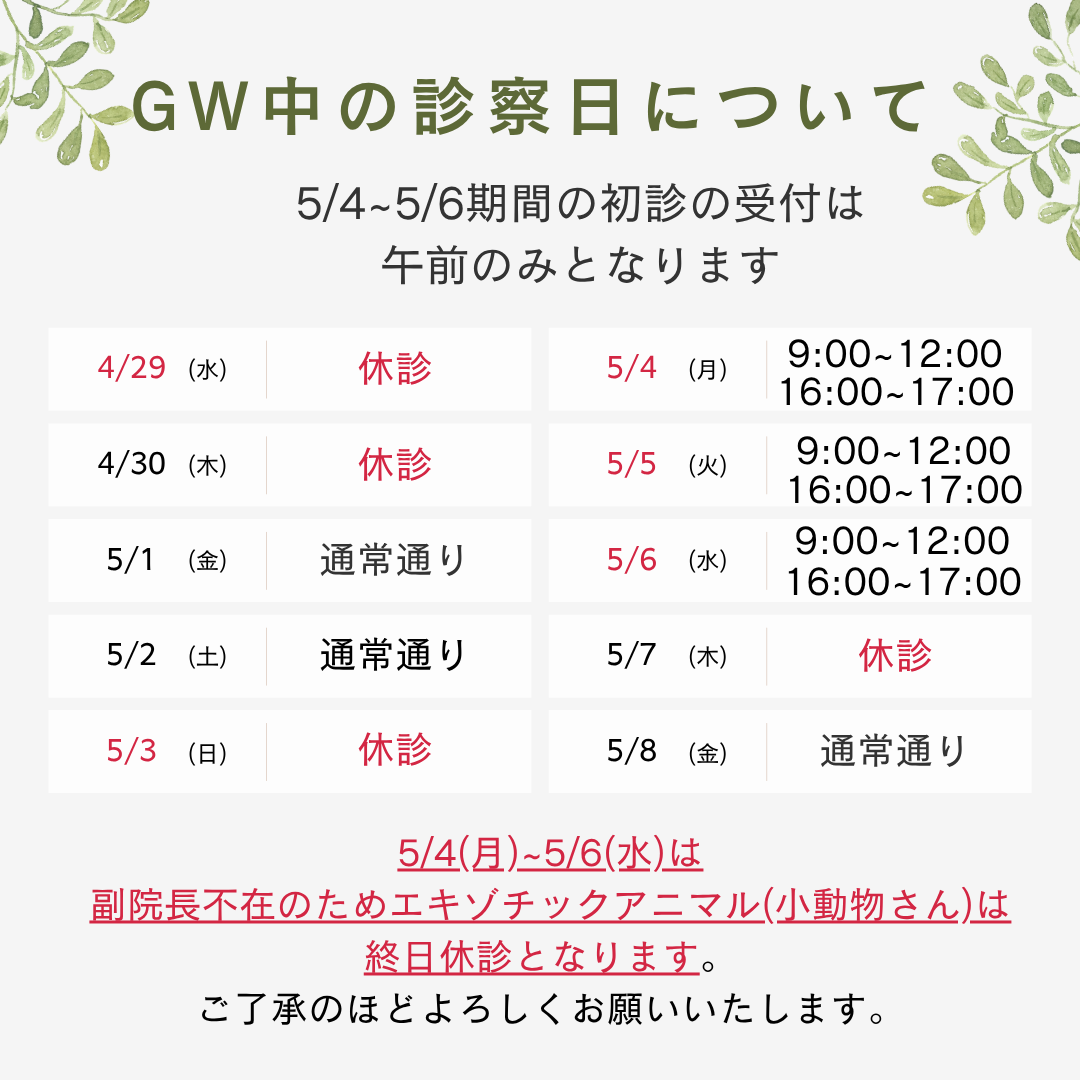 今年のゴールデンウィーク期間中の診察スケジュールが決定しました。